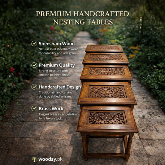 Premium Handcrafted Sheesham Wood Nesting Tables – Brass Inlay Carved Side Tables Set (4 Pieces)