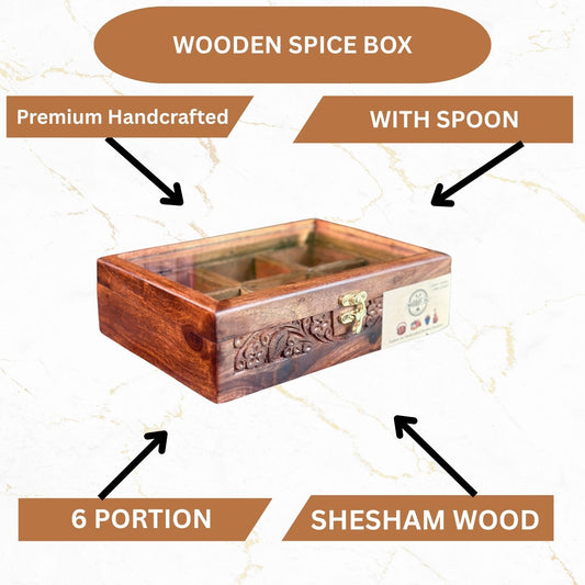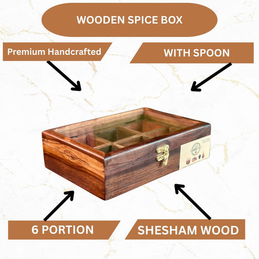 6 Portion Wooden Spice Box with Spoon & Non-Breakable Glass Lid