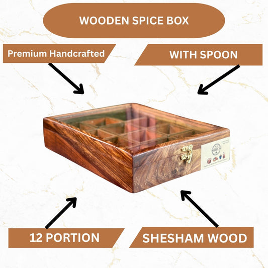 12 Portion Wooden Spice Box with Spoon & Non-Breakable Glass Lid