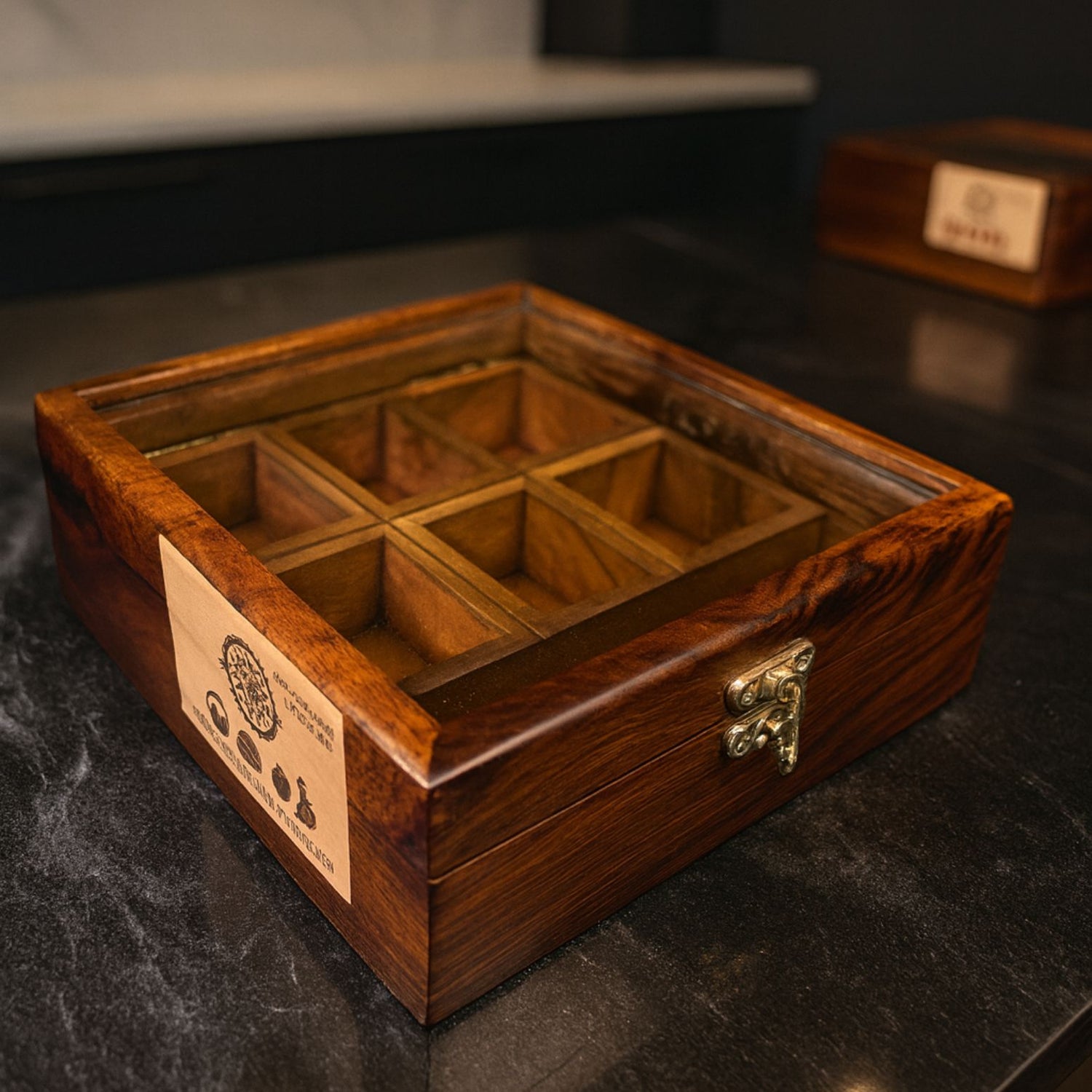 6 Portion Wooden Spice Box with Spoon & Non-Breakable Glass Lid