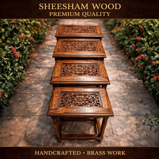 Premium Handcrafted Sheesham Wood Nesting Tables – Brass Inlay Carved Side Tables Set (4 Pieces)