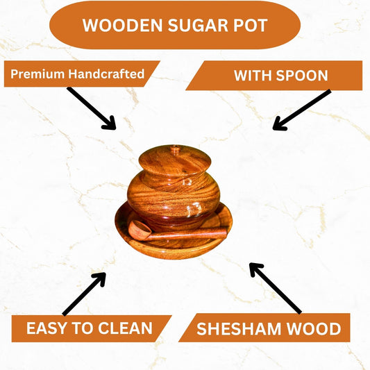Handcrafted Wooden Sugar Pot with Spoon & Plate – Premium Sheesham Wood Finish