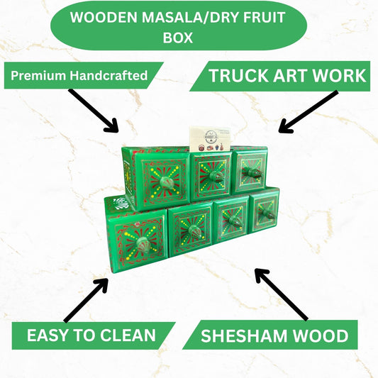 Hand-Painted Green Wooden Spice Box – 7 Portion Truck Art Design | Sheesham Wood Kitchen Organizer