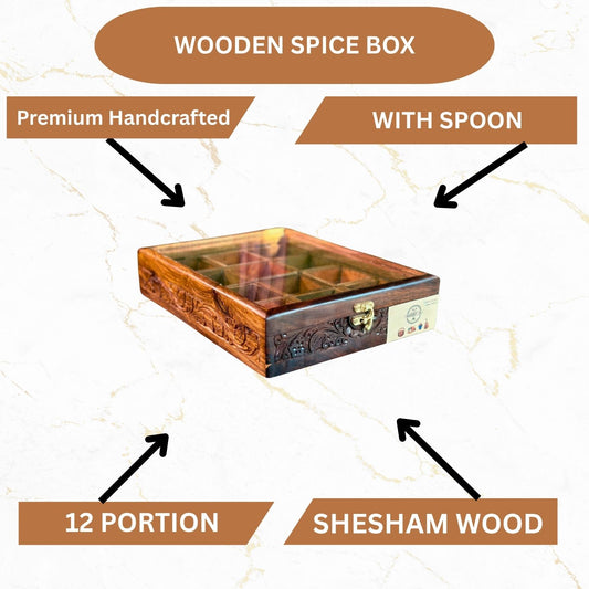 12 Portion Handcarved Design Wooden Spice Box with Spoon & Non-Breakable Glass Lid