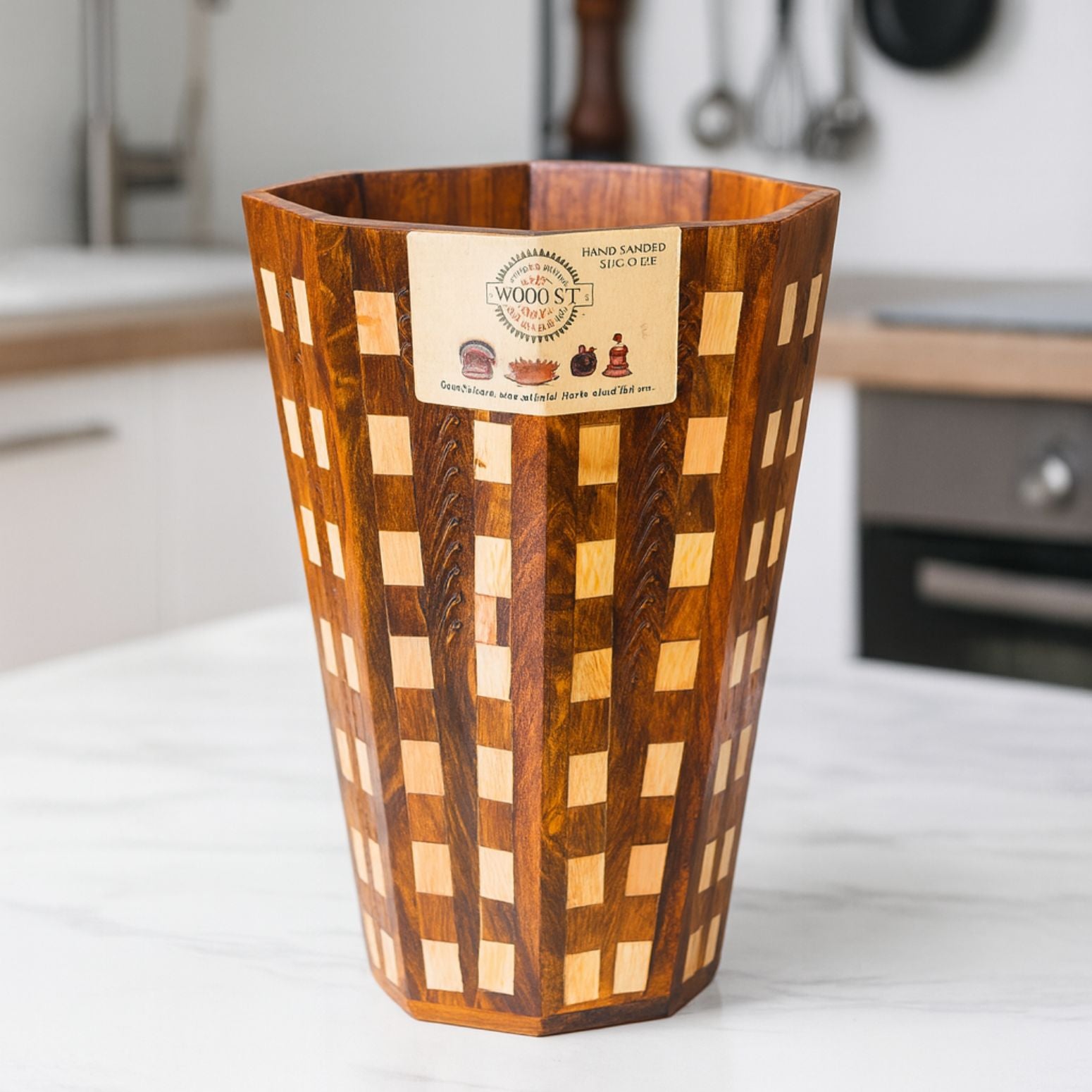 Handcrafted Wooden Dustbin in Tukri Style – Natural Sheesham Wood with Handcarved Detailing | 11” Height
