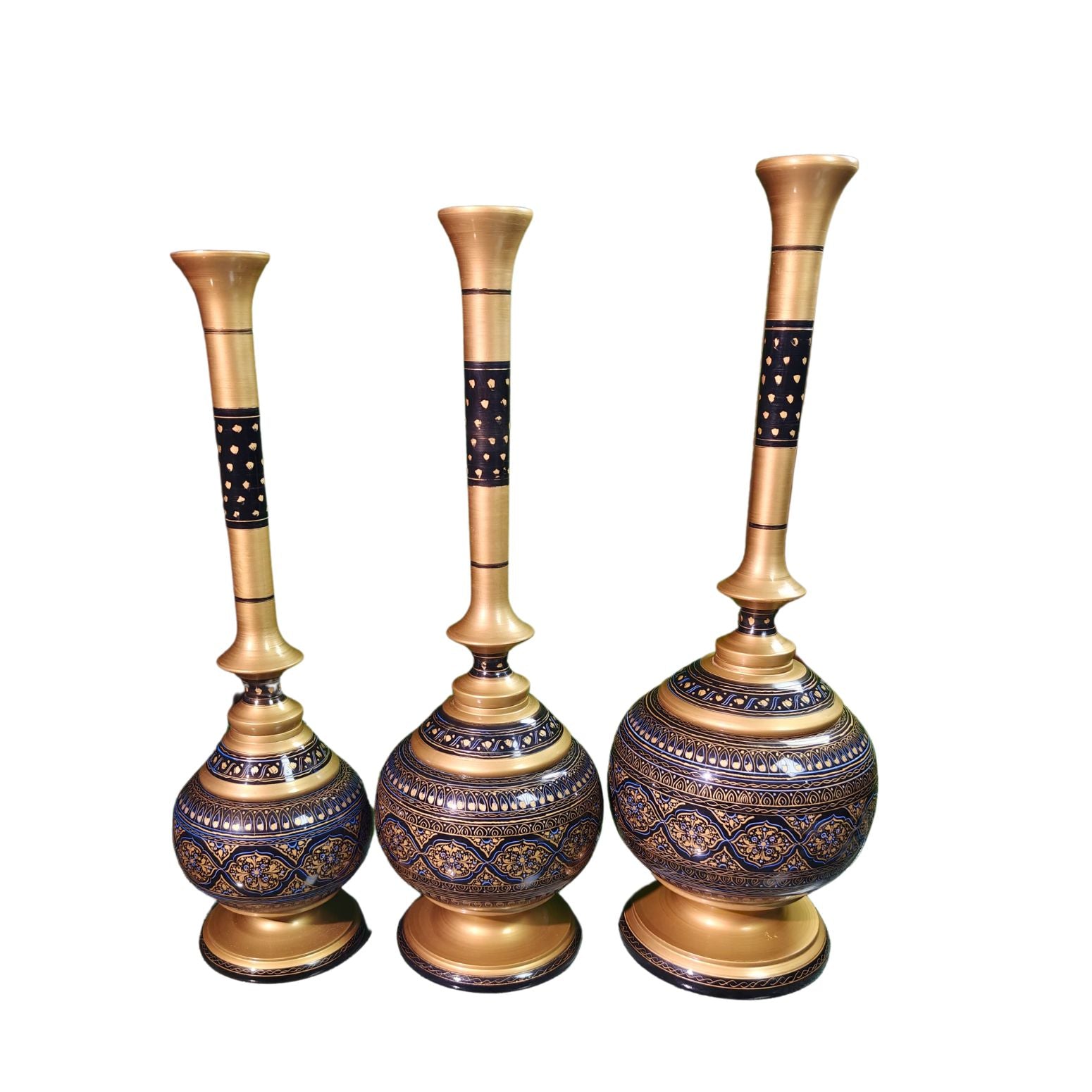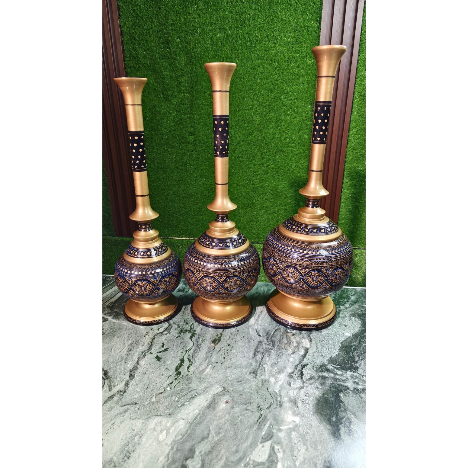 Each vase is hand-carved by skilled artisans, featuring intricate patterns that celebrate the beauty of Naqshi workmanship. The set includes three vases in different sizes, ideal for styling as a trio or displaying individually on shelves, mantels, or tabletops.