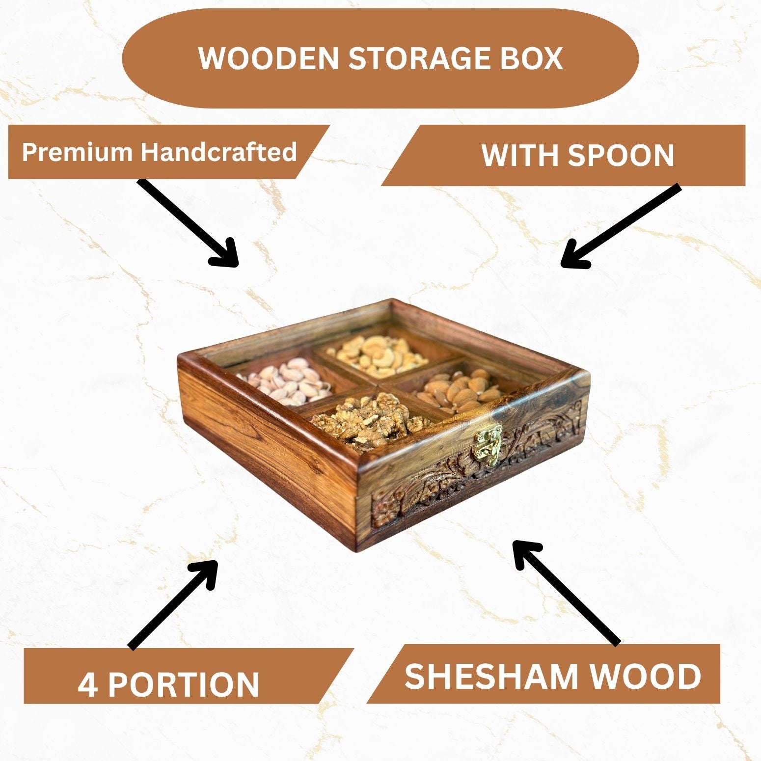 Wooden Storage Box in Pure Sheesham Wood – 4 Portion Dry Fruit & Spice Box with Spoon & Non-Breakable Glass Lid